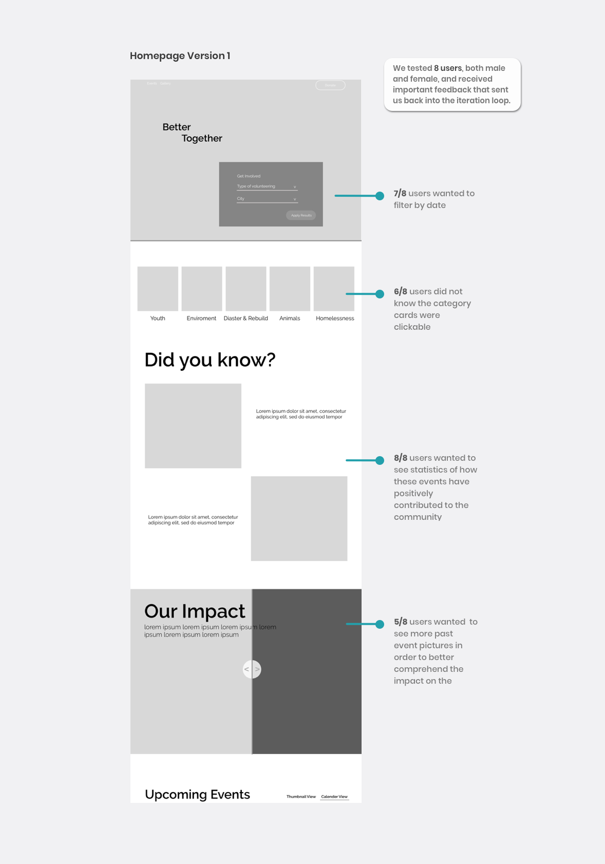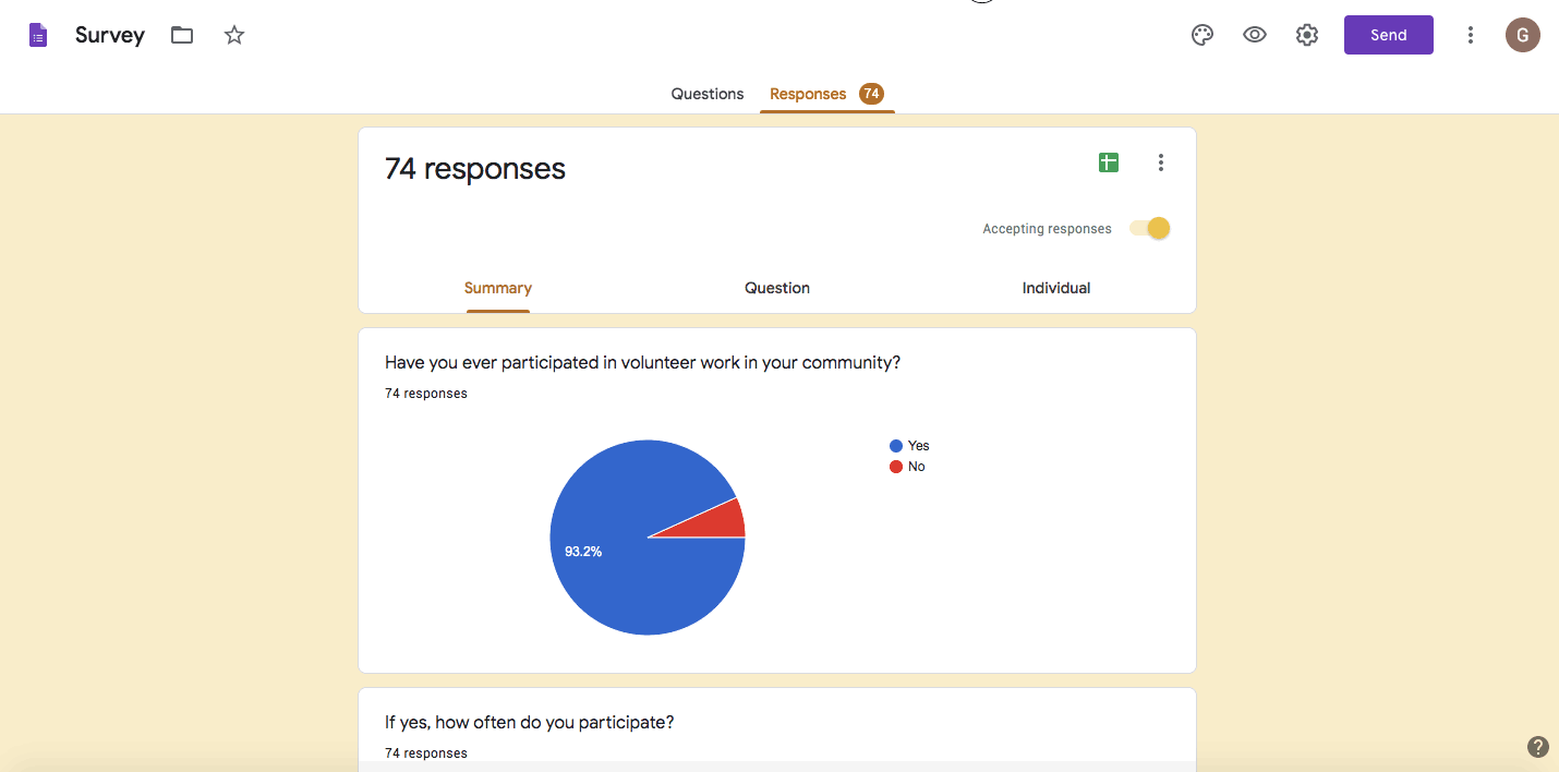 Over 74 participants completed our survey and it allowed us to validate our assumptions regarding the current experience of volunteer searching. It brought insight on the users pain points. Big takeaways that we discovered were the preferred method of volunteering and who our target audience was.