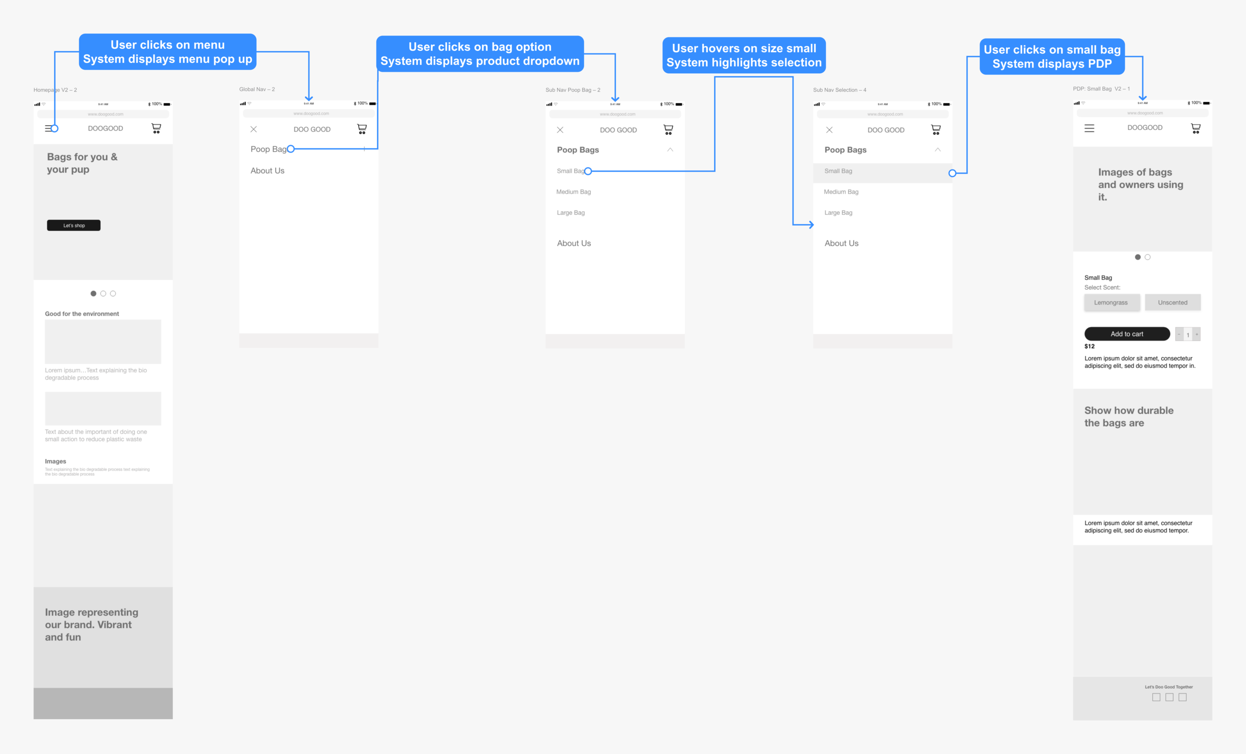 When we started this project we knew right away we wanted to create a contrast to the typical eco-friendly dog bag in the market. I wanted Cory (persona) to feel delighted and informed while using Doo Good. Choosing bright and fun colors to represent the brand while keeping the images clean and minimal.
