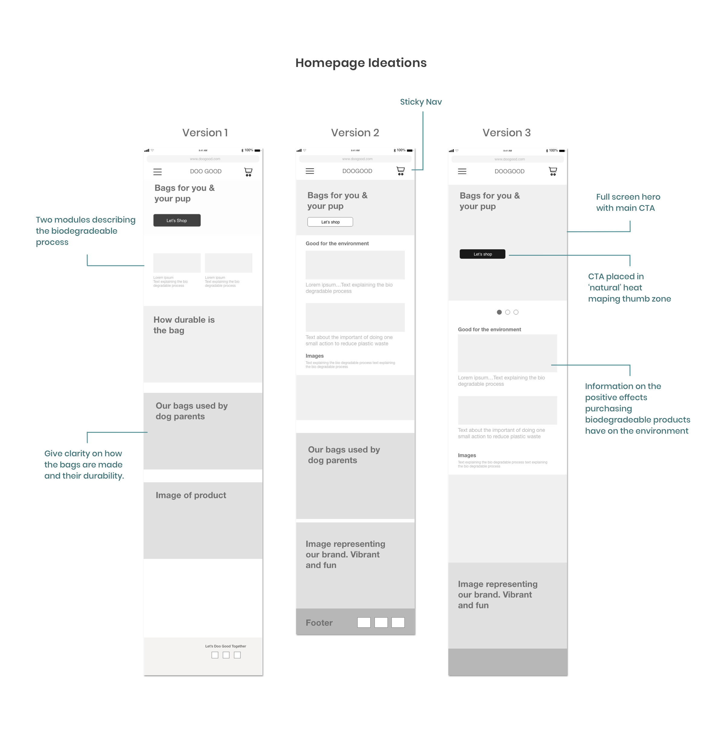 During our research we found doggie bag sites that looked very similar. Most of the brands were earth-tone colors (green and brown) to represent sustainability, but, also exuded no-thrills or character. This was the first problem we faced, how do we differentiate ourselves and create a modern, sleek and fun poop bag brand? We found some inspiring brands that we considered as best in class and got major inspiration from.